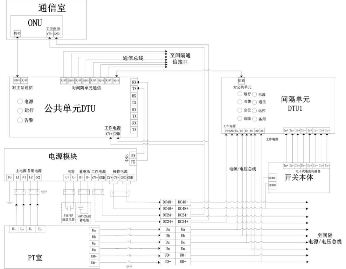 Enet490 一二次融合DTU公共單元和Enet460一二次融合三遙動作型DTU間隔單元組成了一二次融合智能分布式DTU的實現(xiàn)方案:
